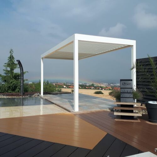 Užívejte si příjemného posezení od března až do října! S pergolou Artosi je to možné. Jak? Díky hliníkovým naklápěcím lamelám Vás efektivně ochrání před sluncem, deštěm a třeba i sněhem. A když přidáte ještě boční roletu, nerozhodí Vám grilovací oheň ani boční vítr. Bioklimatická pergola Artosi je moderní alternativou ke klasické dřevěné pergole.
