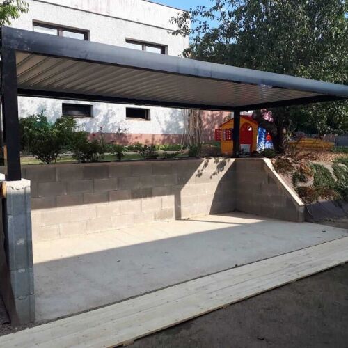 A: Volně stojící, lamely rovnoběžně s kratší stranou pergoly