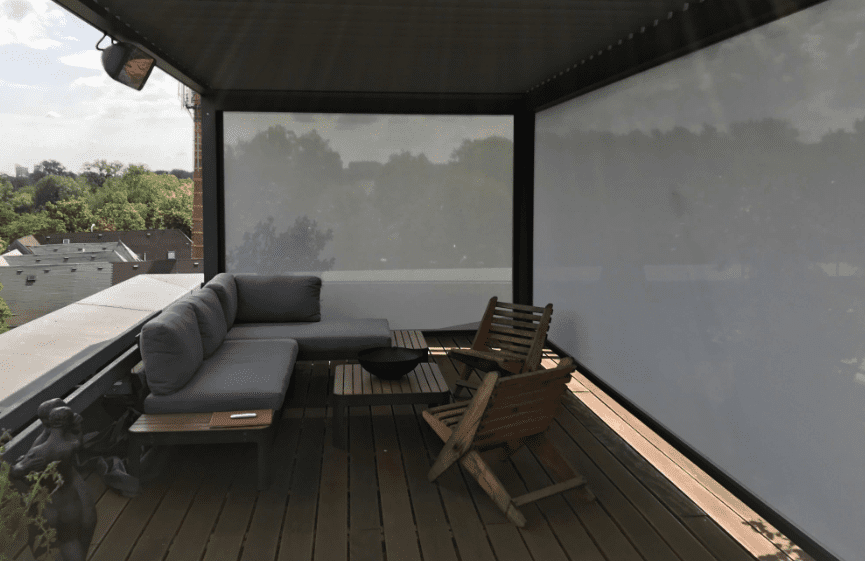 Ukázka screenových rolet využitých jako boční stínění pergoly.