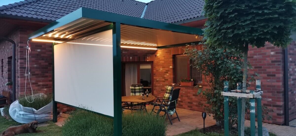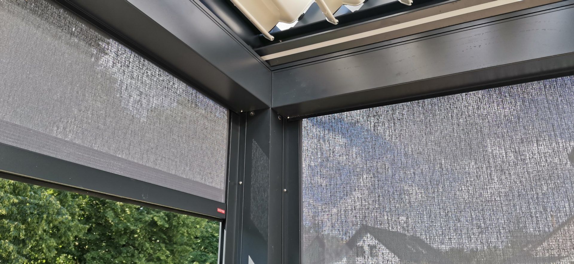 „ZIPové“ vedení pak funguje i jako síť proti hmyzu, takže si večer „zatáhnete“, rozsvítíte a nepůjde na vás žádný komár ani moucha. Pokud nemáte lamelovou pergolu, ale pergolu s pevnou střechou (skleněnou, polykarbonátovou), využijete screenovou roletu i proti slunci zeshora. Nejčastěji používáme venkovní rolety typu Veranda.