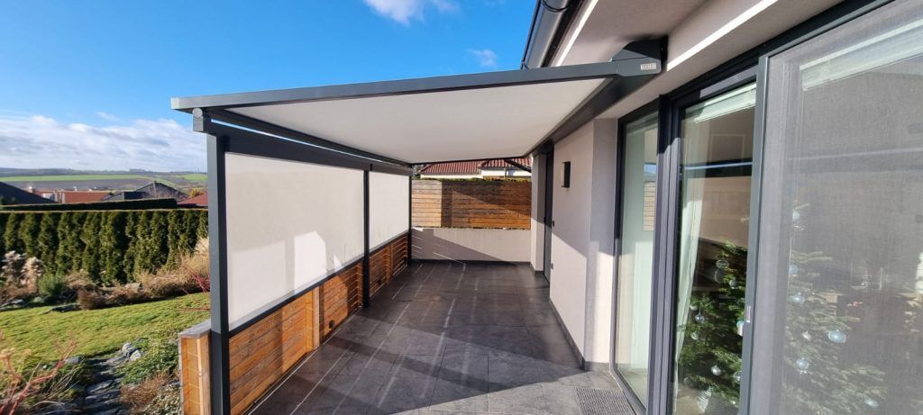 - Poloprůhledná screenová tkanina účinně ochrání terasu, zároveň však propouští i část přirozeného světla.